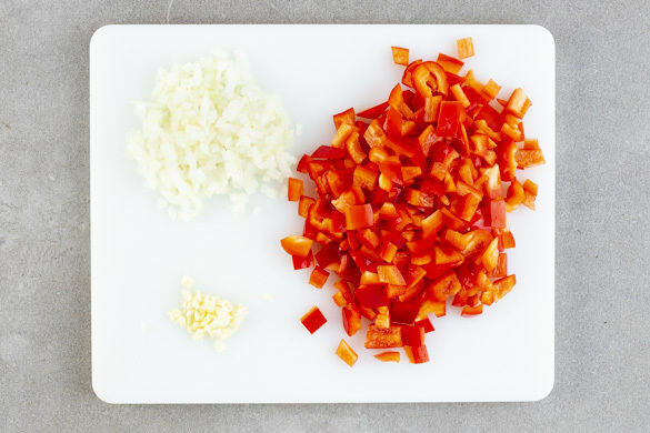 Den Backofen auf 240°C (220°C Umluft) vorheizen. Die Paprika vierteln, entkernen und in ca. 1cm große Stücke schneiden. Die Zwiebeln schälen, halbieren und in feine Würfel schneiden. Den Knoblauch schälen und ebenfalls fein würfeln.