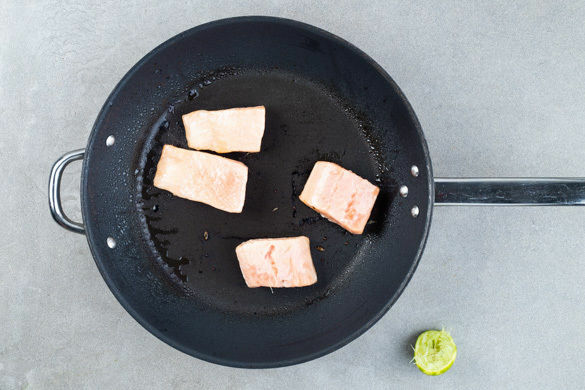Den Fisch in einer mittelgroßen Pfanne mit 1EL Olivenöl bei starker Hitze auf der Hautseite 2–3Min. anbraten. Mit dem Limettensaft ablöschen. Den Fisch aus der Pfanne nehmen, die Haut vorsichtig abziehen und in dünne Streifen schneiden. Tipp: Wer mag, kann die Haut nochmals separat braten, sodass sie noch knuspriger wird.