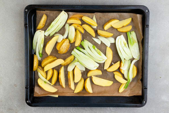 Die harten Stängel und den Strunk des Fenchels entfernen, dann den Fenchel in dünne Streifen schneiden. Die Kartoffeln samt Schale in dünne Spalten schneiden. Das Gemüse auf ein mit Backpapier ausgelegtes Backblech geben.