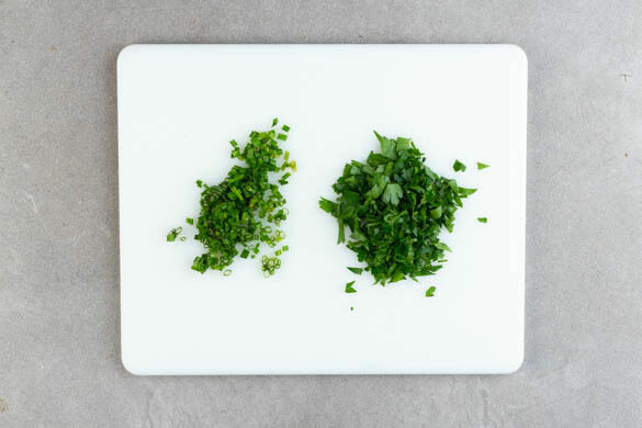 Den Schnittlauch in feine Ringe schneiden. Die Petersilie samt Stängeln ebenfalls fein schneiden.