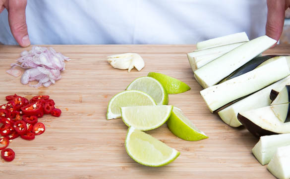 Den Backofen auf 220°C (200°C Umluft) vorheizen. Die Aubergine in 2–3cm dicke Spalten schneiden. Die Zwiebeln schälen und in feine Ringe schneiden. Den Knoblauch schälen und fein würfeln. Die Limette in Spalten schneiden. Die Peperoni in feine Ringe schneiden. Tipp: Wer es weniger scharf mag, verwendet weniger Peperoni und entfernt die Kerne.