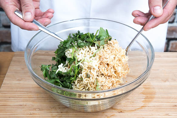 Die Nudeln in das kochende Wasser geben und in 3–5Min. bissfest kochen. In ein Sieb abgießen und kalt abschrecken. Inzwischen die Minzeblätter abzupfen und fein schneiden. Den Koriander samt Stängeln fein schneiden.