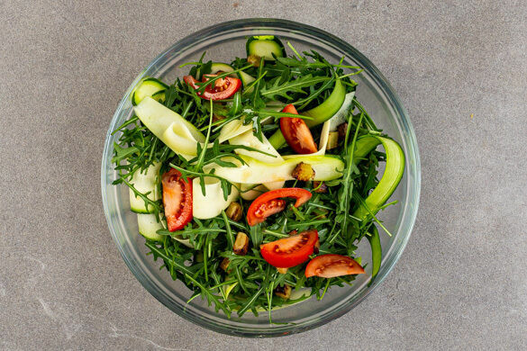 Den Rucola mit den Zucchinistreifen, den Zucchiniwürfeln, den restlichen Tomaten und dem Mozzarella vermengen. Aus 2TL Olivenöl, 1TL Essig sowie je 1 Prise Salz und Pfeffer ein Dressing anrühren und mit dem Salat mischen. Den Salat mit den Kichererbsen, dem restlichen Käse und den übrigen Pinienkernen anrichten und mit dem Pesto garniert servieren.