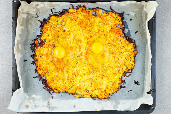 Möglichst ein tiefes Backblech mit Backpapier auslegen oder das Blech mit etwas Olivenöl einreiben. Die Röstimischung gleichmäßig und dünn darauf verteilen. Mit den Fingern 4 kleine Kuhlen für die Eier formen. Die Rösti im Ofen in 25–30Min. goldbraun und knusprig backen. Tipp: Die Ofentür ab und an kurz öffnen, damit die Feuchtigkeit entweichen kann.