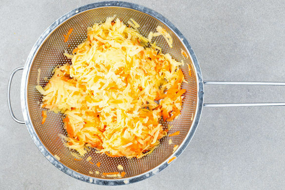 Den Backofen auf 220°C (200°C Umluft) vorheizen. Die Karotten und die Kartoffeln schälen und mit einer Küchenreibe grob raspeln. Mit ½–1TL Salz mischen und ca. 5Min. ruhen lassen.
