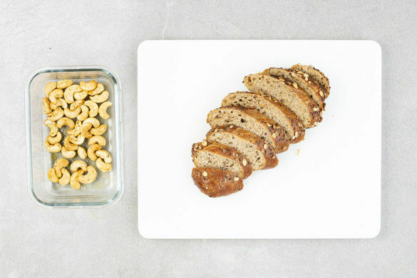 Die Baguettes 8–10Min. im Ofen aufbacken und anschließend in Scheiben schneiden. Die Cashews in einer kleinen Auflaufform 6–8Min. im Ofen rösten.