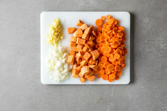 Die Karotte ggf. schälen und in 1–2cm große Würfel schneiden. Die Süßkartoffeln schälen und ebenfalls in 1–2cm große Würfel schneiden. Die Zwiebel und den Ingwer schälen und grob würfeln.