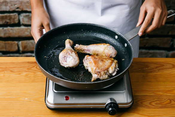 In einer großen Pfanne 1-2EL Olivenöl hoch erhitzen und das Hähnchen ca. 2-3Min. von jeder Seite knusprig anbraten, dann in eine Auflaufform geben. Die Pfanne nicht auswischen.