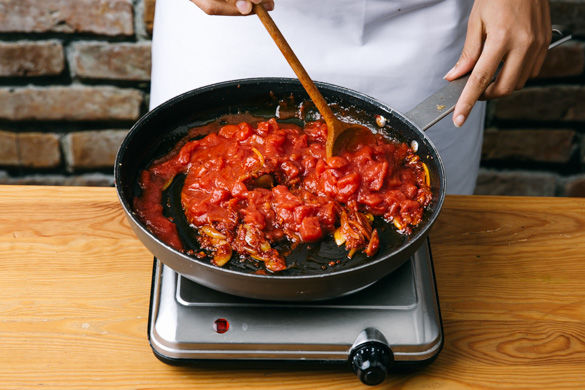 Die Zwiebelstreifen und Knoblauch in der Fleischpfanne ca. 2-3Min. anschwitzen, das Tomatenmark unterrühren und mit gehackten Tomaten und 100ml Wasser ablöschen. Mit Salz, Pfeffer und etwas Zucker abschmecken und über die Hähnchen in die Auflaufform geben. Alles für ca. 25-30Min im Ofen garen, die letzten ca. 10Min. die Oliven mit in die Form geben.