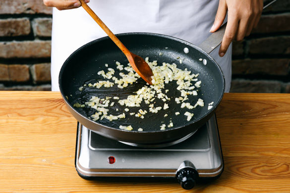 Inzwischen 1,2L Wasser im Wasserkocher aufkochen. Den Safran im Mörser oder mit dem Messergriff zerstoßen und in 1-2EL heißen Wasser auflösen. Den Brühwürfel im restlichen kochenden Wasser auflösen. In einer großen Pfanne 1-2EL Olivenöl mittelhoch erhitzen und die Zwiebelwürfel ca. 1-2Min. anschwitzen.