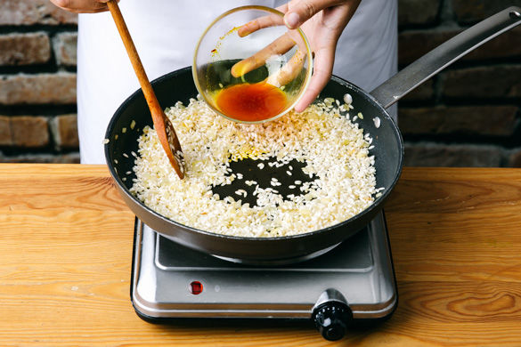 Den Reis zu den Zwiebeln geben, ca. 1Min. mitrösten und dann mit Safranwasser ablöschen. Den Reis nach und nach mit Brühe ablöschen und regelmäßig einrühren, bis die Brühe aufgebraucht und der Reis bissfest ist - das dauert ca. 18-20Min.