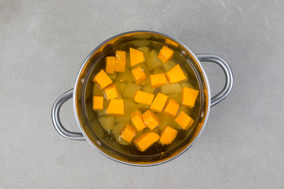 In einem großen Topf ausreichend leicht gesalzenes Wasser für Kürbis und Kartoffeln zum Kochen bringen. Den Kürbis halbieren, mit einem Löffel entkernen und in ca. 2–3cm große Stücke schneiden. Die Kartoffeln schälen und ebenfalls in ca. 2–3cm große Stücke schneiden.