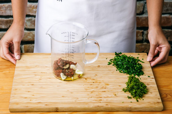 Den Ofen auf 160°C Umluft vorheizen. Den Dill und die Petersilie samt Stängel fein hacken. Die Tomaten abtropfen lassen und grob hacken. Den Knoblauch schälen und vierteln. Tomaten und Knoblauch mit 1EL Olivenöl und schwarzen Pfeffer mit einem Stabmixer zu einer cremigen Masse pürieren. Mit der Hälfte der Kräuter mischen.