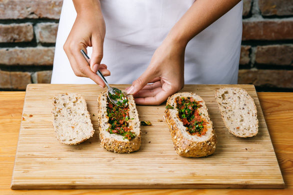 Das obere Drittel des Brötchens längs abschneiden und das Innere des Brötchens ausschaben, dabei aufpassen, dass die Kruste ganz bleibt. Mit der Tomatencreme ausstreichen.