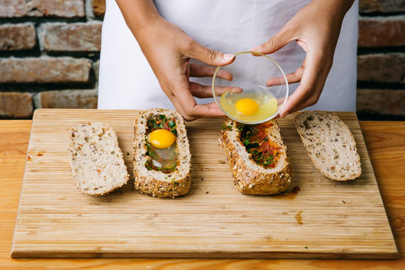 Nun vorsichtig je ein Ei über das Brötchen aufschlagen und hinein gleiten lassen. Die Brötchen auf einem mit Backpapier ausgelegten Backblech für ca. 10-15Min. im Ofen offen rösten, für die letzten ca. 3-5Min. die Deckel mitbacken.
