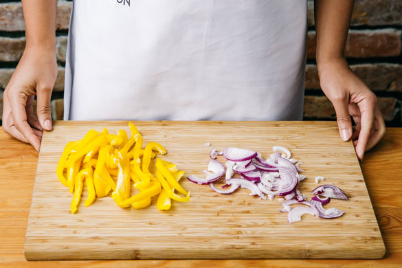 Inzwischen die Paprika halbieren, entkernen und in feine Streifen schneiden. Die Zwiebel schälen, halbieren und ebenfalls in dünne Streifen schneiden.