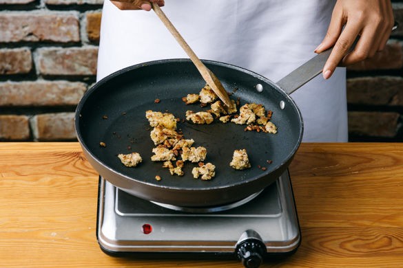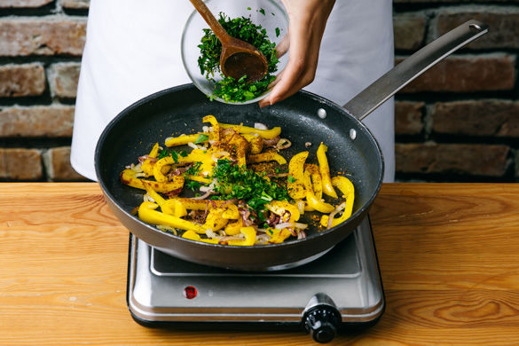 Eine große Pfanne mit 1-2EL Olivenöl mittelhoch erwärmen und die Paprika mit den Zwiebeln ca. 3-4Min. anbraten, bis sie leicht geröstet sind. Die Hitze runterdrehen und mit dem Gewürz sowie restlichen Kräutern mischen. Aus der Pfanne nehmen, die Pfanne auswischen.