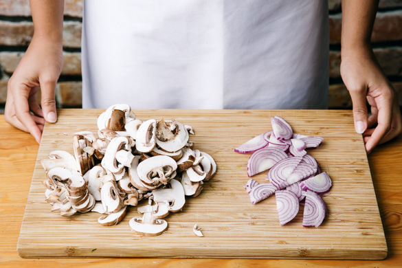 Den Grillofen auf 250°C vorheizen. Die Pilze mit einem feuchten Küchenkrepp oder einer Bürste putzen und in feine Scheiben schneiden. Die Zwiebel schälen, halbieren und in dünne Scheiben schneiden.