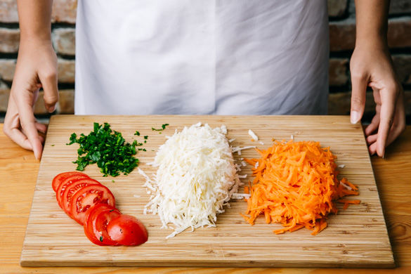 Die Karotten und den Knollensellerie schälen und mit einer Küchenreibe grob raspeln. Die Petersilie mit Stängel fein hacken. Die Tomaten ebenfalls in feine Scheiben schneiden.
