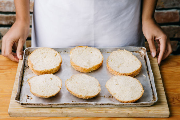 Die Burgerbrötchen halbieren, auf einem Backblech oder Rost im Grill für ca. 1-2Min. goldgelb rösten.