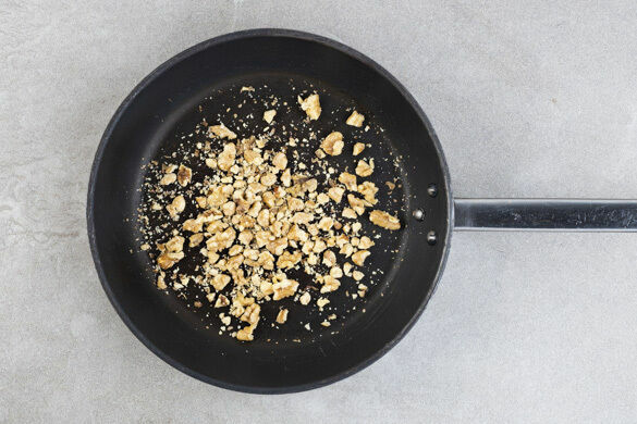 Die Walnüsse grob hacken und in einer kleinen Pfanne ohne Zugabe von Fett bei mittlerer Hitze 1–2Min. anrösten. Vorsicht, sie können schnell zu dunkel werden. Zum Abkühlen aus der Pfanne nehmen und beiseitestellen, die Pfanne aufbewahren.
