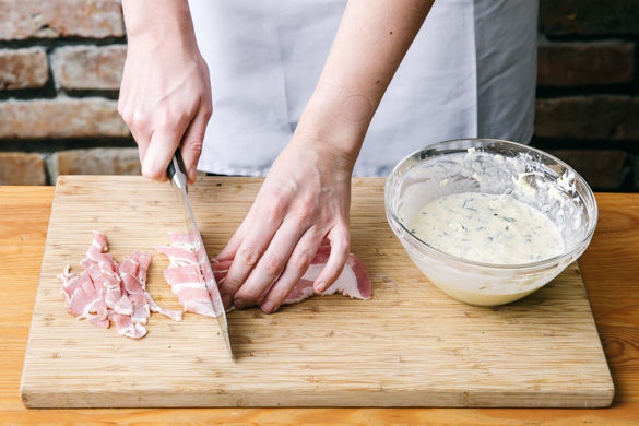 Die Speckscheiben in feine Streifen schneiden und unter die Eierfüllung mischen.