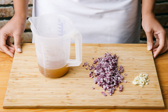 Den Backofen auf 225°C Umluft (245°C Ober-/Unterhitze) vorheizen. Das Fleisch aus dem Kühlschrank nehmen und Raumtemperatur annehmen lassen. Die Zwiebel und den Knoblauch schälen, halbieren und in feine Würfel schneiden. 250ml Wasser in einem Wasserkocher aufkochen und den Brühwürfel darin auflösen.