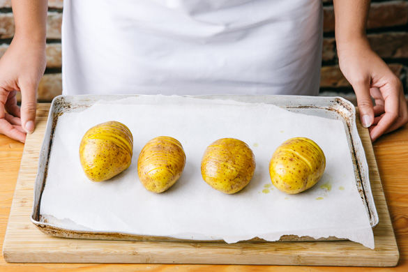 Die Kartoffeln mit einem scharfen Messer ca. 0,5cm breit ein-, aber nicht ganz bis unten durchschneiden: Sie sollen nicht auseinanderfallen, sondern fächerartig aufklappen. Die Kartoffeln auf ein mit Backpapier ausgelegtes Backblech geben, mit etwas Salz und 1EL Olivenöl einreiben und ca. 20–25Min. backen, bis sie goldbraun und gar sind.