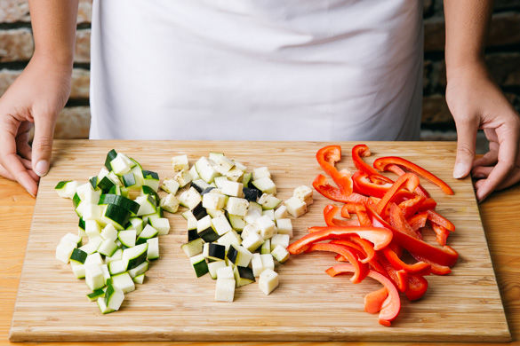Die Zucchini und die Aubergine in ca. 1cm große Würfel schneiden. Die Auberginenwürfel leicht salzen. Die Paprika vierteln, entkernen und in feine Streifen schneiden.