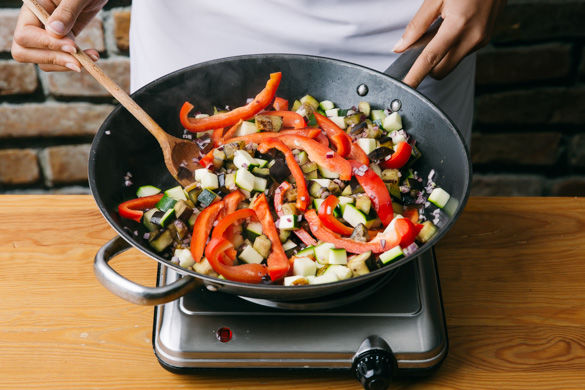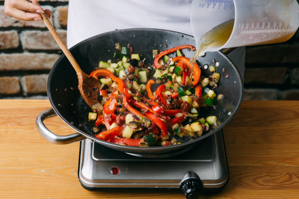 In einer großen Pfanne 1EL Olivenöl hoch erhitzen und die Auberginenwürfel darin ca. 1–2Min. scharf anbraten. Die Zucchini, die Paprika und die Zwiebeln dazugeben und weitere ca. 4–5Min. braten.