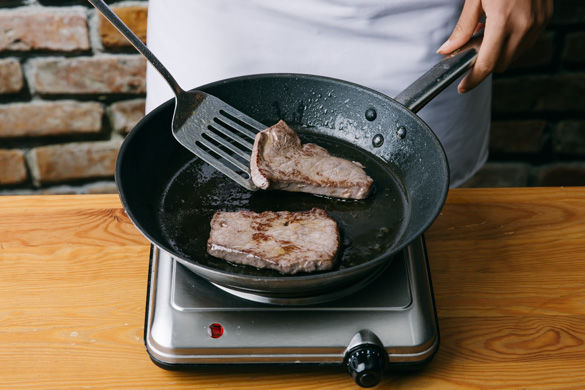 Die Steaks in einer ofenfesten Pfanne mit 1EL Öl bei hoher Hitze von jeder Seite ca. 1Min. scharf anbraten, mit Salz und Pfeffer würzen und je nach gewünschtem Gargrad noch für ca. 5–10Min. in den Ofen geben. Tipp: Bei 5Min. wird das Steak „blutig“, bei 10Min. „gut durch“. Das Fleisch in Tranchen schneiden und mit dem Gemüse und den Kartoffeln servieren.
