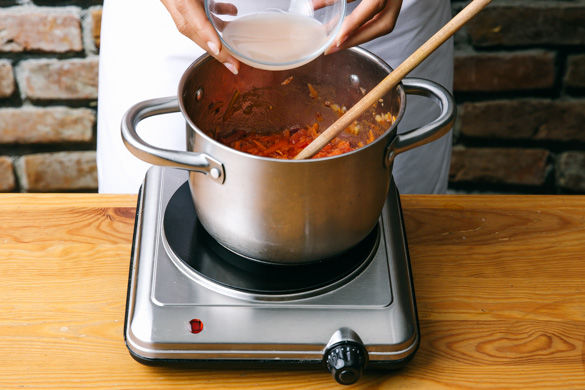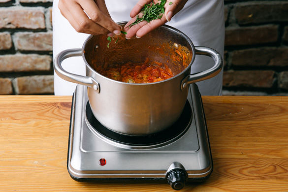 Inzwischen in einem großen Topf 1-2EL Olivenöl auf mittlerer Hitze erwärmen und die Zwiebeln und Karotten ca. 2-3Min. anschwitzen. Dann die Tomaten und den restlichen Abtropfsaft des Thunfischs hinzugeben und ca. 2-3Min. köcheln lassen, mit Salz, Zucker und Pfeffer abschmecken.