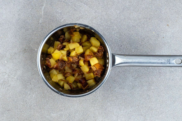 Den Backofen auf 200°C (180°C Umluft) vorheizen. Die Äpfel schälen, halbieren und entkernen. 3 Hälften in ca. 1cm große Würfel schneiden, in einem kleinen Topf mit 120ml Wasser aufkochen und anschließend ca. 10Min. bei mittlerer bis niedriger Hitze garen. Tipp: Den restlichen Apfel als Snack verspeisen.