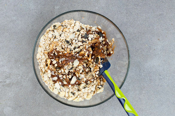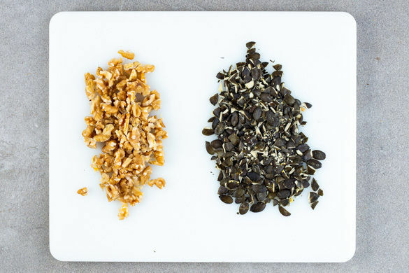 Die Walnüsse und die Kürbiskerne grob hacken und mit den Mandeln und den Haferflocken vermengen.