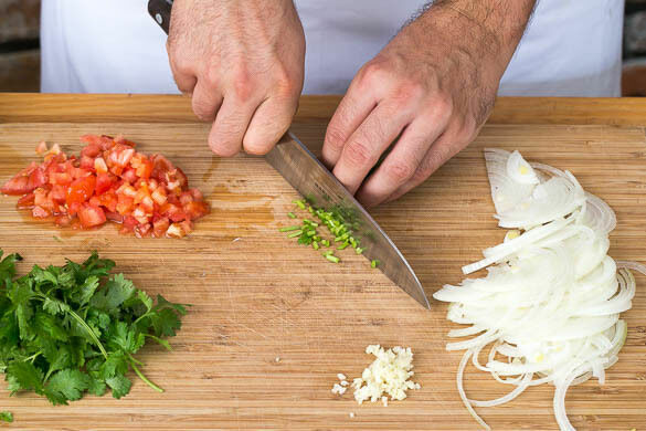 Die Tomate in ca. 1cm kleine Würfel schneiden. Die Zwiebel schälen, halbieren und in feine Streifen schneiden. Den Knoblauch schälen und fein würfeln. Die Petersilienblätter von den Stängeln zupfen, die Petersilienstiele fein hacken.