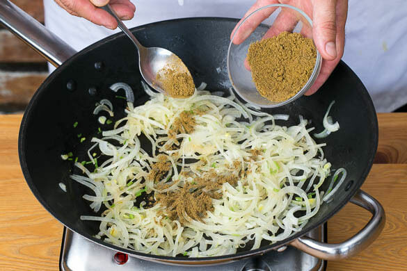 Die Zwiebeln und die gehackten Petersilienstängel in einer großen Pfanne oder einem Wok mit 2EL Pflanzenöl bei mittlerer Hitze 3–4Min. anbraten. Inzwischen die Enden der Bohnen entfernen. Den Knoblauch und die Gewürzmischung dazugeben und alles weitere 1–2Min. braten.