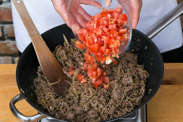 Das Hackfleisch zu den Zwiebeln geben und 3–5Min. mitbraten, bis es goldbraun angeröstet ist. Die Tomaten zugeben und mit 200ml Wasser ablöschen. Das Brühgewürz unterrühren, mit Salz und Pfeffer abschmecken und alles 3Min. köcheln lassen. Dann die Bohnen unterheben und ca. 7Min. mitgaren.