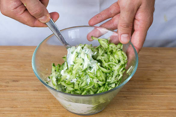 Die Gurke mit einer Küchenreibe grob raspeln und anschließend in einem Sieb gut abtropfen lassen. 2EL Joghurt in einem Schälchen beiseitestellen, den restlichen Joghurt mit der geriebenen Gurke vermischen und die Raita mit Salz und Pfeffer abschmecken.