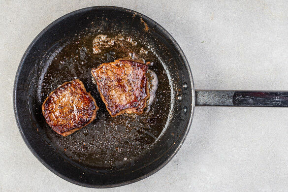 Das Fleisch trocken tupfen und in derselben Pfanne mit 1EL Olivenöl bei starker Hitze auf jeder Seite 2–3Min. braten, abhängig davon, ob es medium oder eher durchgebraten sein soll.