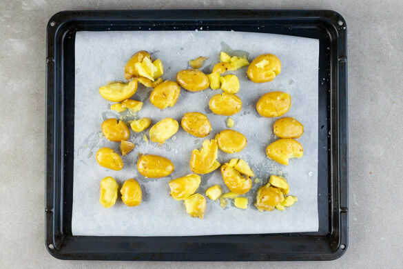 Die Kartoffeln in ein Sieb abgießen und mit 1EL Olivenöl sowie 1 Prise Salz vermengen. Auf ein mit Backpapier ausgelegtes Backblech geben und mit der Unterseite des Topfes leicht platt drücken, dann ca. 15min. im Ofen knusprig backen.
