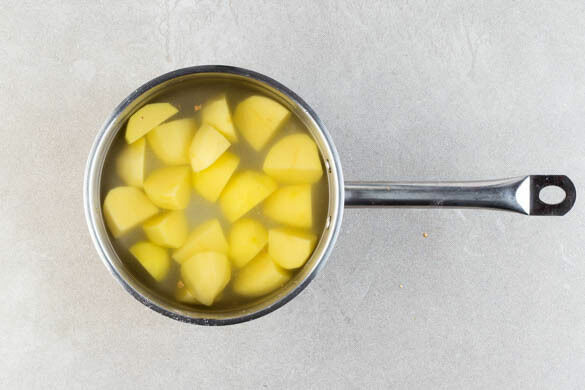 Den Backofen mit Grillfunktion oder Ober-/Unterhitze auf 240°C vorheizen. In einem mittelgroßen Topf ausreichend gesalzenes Wasser für die Kartoffeln zum Kochen bringen. Die Kartoffeln schälen und je nach Größe vierteln oder achteln, dann in das kochende Wasser geben und 15–20Min. kochen lassen, bis die Kartoffeln gar sind.