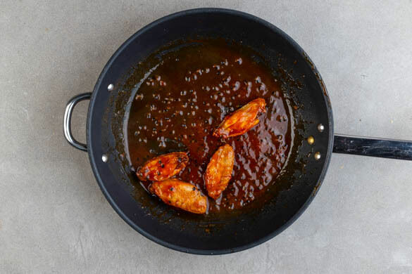 Das Fleisch samt Bratensaft in die Pfanne geben und mit der Sauce vermengen, bis es vollständig bedeckt ist. Die Chicken Wings, den Reis und den Krautsalat auf Teller verteilen, ggf. übriges Dressing in der Schüssel zurücklassen. Den Reis mit ggf. übriger Glasur beträufeln.
