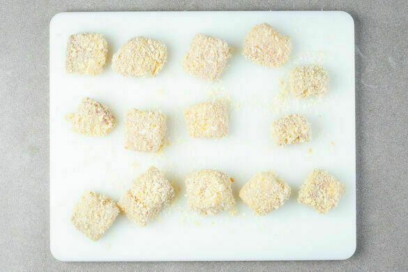 Den Fisch kalt abspülen, trocken tupfen und in ca. 3cm große Stücke schneiden, dabei evtl. vorhandene Gräten mit einer Pinzette entfernen. Mit Salz und Pfeffer würzen. Auf einem tiefen Teller 1 Ei verquirlen. Die Fischstücke nacheinander in 4EL Mehl wenden, dann durch das Ei ziehen und anschließend im Panko-Paniermehl wenden.
