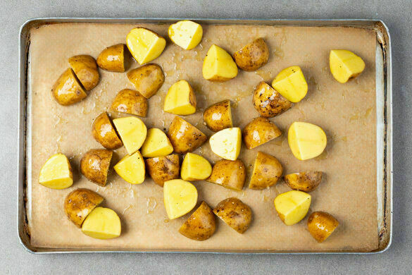 Den Backofen auf 240°C (220°C Umluft) vorheizen. Die Kartoffeln samt Schale vierteln und auf ein mit Backpapier ausgelegtes Backblech geben. Mit 2EL Olivenöl, 1TL Salz und 1 kräftigen Prise Pfeffer vermengen und ca. 25 Min. im Ofen rösten.
