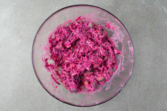 Den Joghurt mit dem Knoblauch, dem Dill und 2EL Olivenöl verrühren. Die Rote Bete und die Gurke unterheben und das Tzatziki mit Salz und Pfeffer abschmecken.