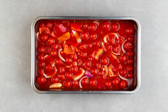 Die Chiliflocken samt Einlegesud, die Kirschtomaten, die ½ des Brühgewürzes, die Paprika, die Korianderstängel und die Zwiebelspalten mit 150ml Wasser in eine mittelgroße Auflaufform geben. Mit 1 Prise Zucker sowie Salz, Pfeffer und ggf. mehr Brühgewürz abschmecken.