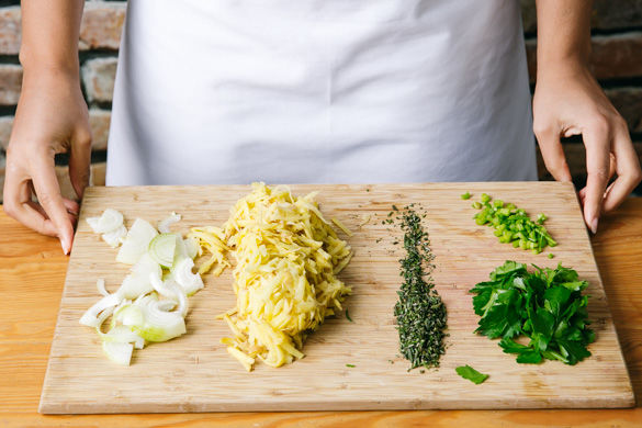 Den Ofen auf 190°C Umluft oder 200°C Ober-/Unterhitze vorheizen. Die Zwiebeln schälen und in feine Streifen schneiden. Die Kartoffeln grob mit der Küchenreibe raspeln. Den Rosmarin vom Stängel streifen und fein hacken. Die Petersilienblätter ebenfalls vom Stängel steifen und zur Seite legen, die Stängel fein hacken.