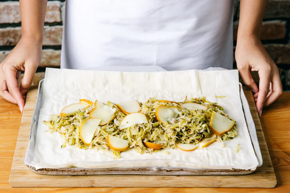 Diesen Strudel gibt es bei dir gefüllt mit Sauerkraut, geraspelten Kartoffeln und geräuchertem Scamorza-Käse! Eingehüllt wird das alles in Blätterteig. Der geht beim Backen schön auf und passt ganz hervorragend für süße wie herzhafte Strudel.