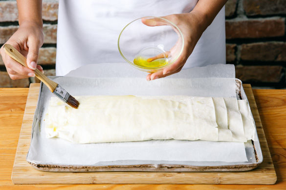 Die freien Ränder über die Füllung falten, die Enden gut zusammendrücken und den Strudel auf Falst legen. Den zweiten Teig mit der restlichen Füllung nach dem gleichen Prinzip füllen und ebenfalls aufs Backblech legen. Beide Strudel mit etwas Olivenöl bestreichen und für ca. 12-15Min. im Ofen goldbraun backen.