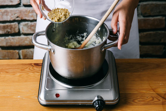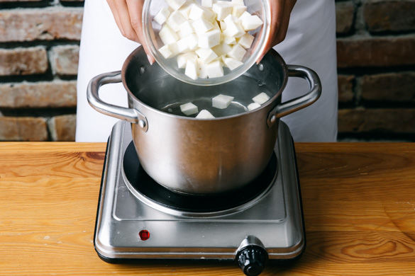 In einem mittleren Topf ausreichend Wasser für den Sellerie aufsetzen. Den Sellerie schälen und in ca. 1-2cm große Würfel schneiden. Sobald das Wasser kocht, die Würfel für ca. 15Min. zugedeckt gar kochen lassen.